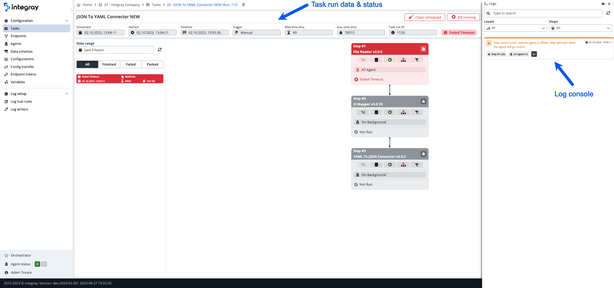 Click the single task on the dashboard to enter the task and see the detail of the selected task run. The detail of the selected task run provides information on Scheduled time, Started time, Finished time, Trigger, Wait time, Execution time, Task run ID, Execution status and the Log
