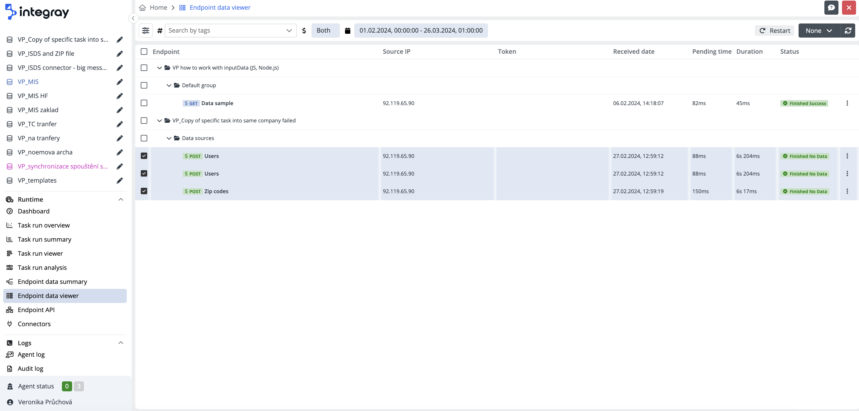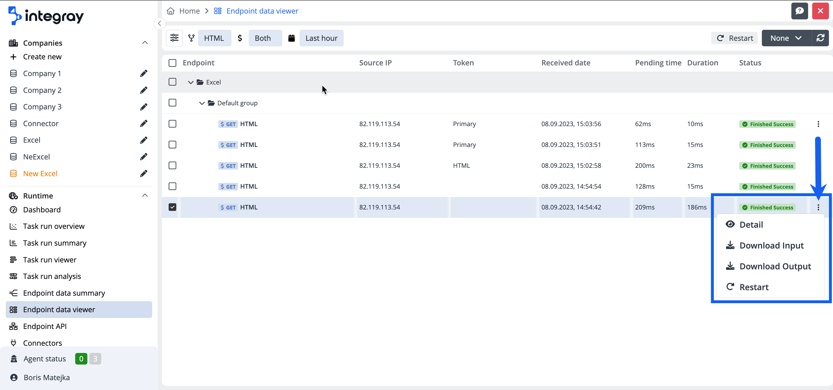 If you check one or more endpoints with the same status (Finished, Failed, In progress, or Parked) in the left part of the viewer, an action button (Cancel, Restart, or Unpark) will appear in the upper right part of the screen, which can trigger an action for the checked endpoints. So you can quickly work with a group of checked endpoints.