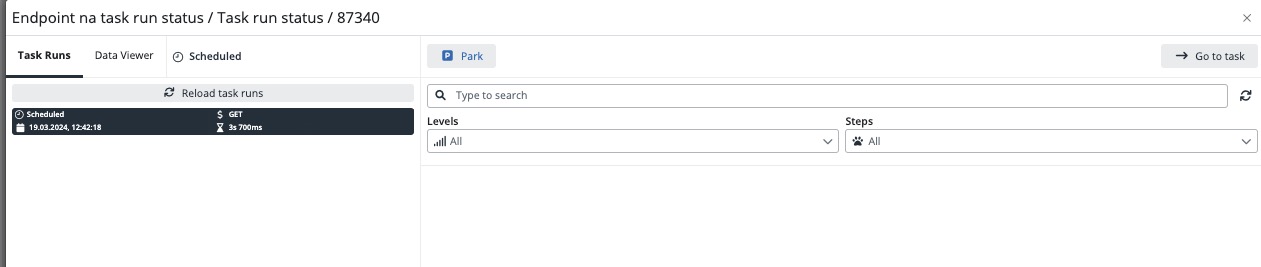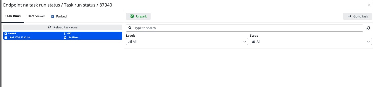 Restart, and there is also theGo to taskbutton available. This view also includes data from the task run log and files Level and Steps, as well as full-text search.