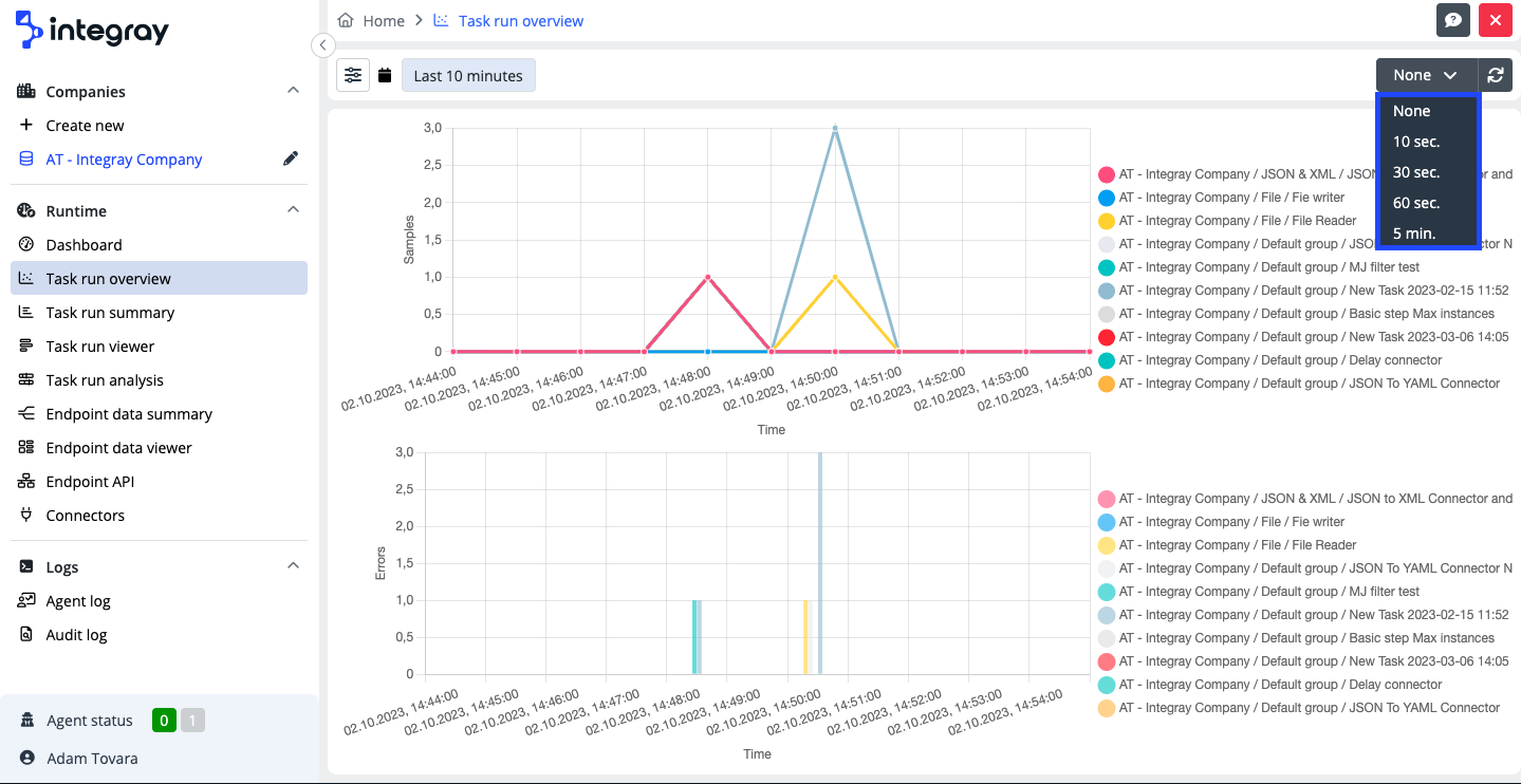 The Task run overview can be automatically refreshed at a set frequency of of 10 sec, 30 sec, 60 sec, 5 min. In case the frequency is set to "None", data refresh must be executed manually.