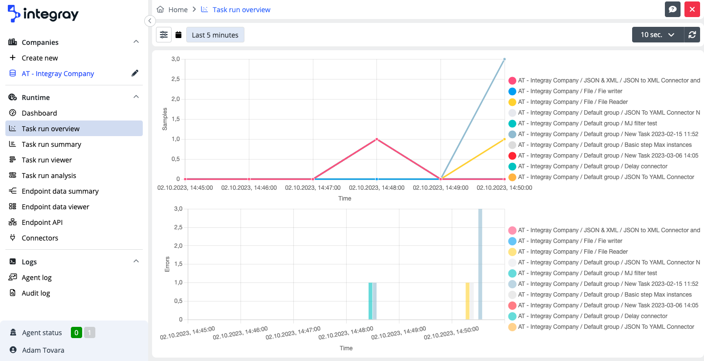 The purpose of the Task Run Overview is to present a combined view of the counts of processed Task Runs and the counts of Task Runs that finished with errors in specific time periods. This allows the user to initiate a more detailed investigation when errors occur.