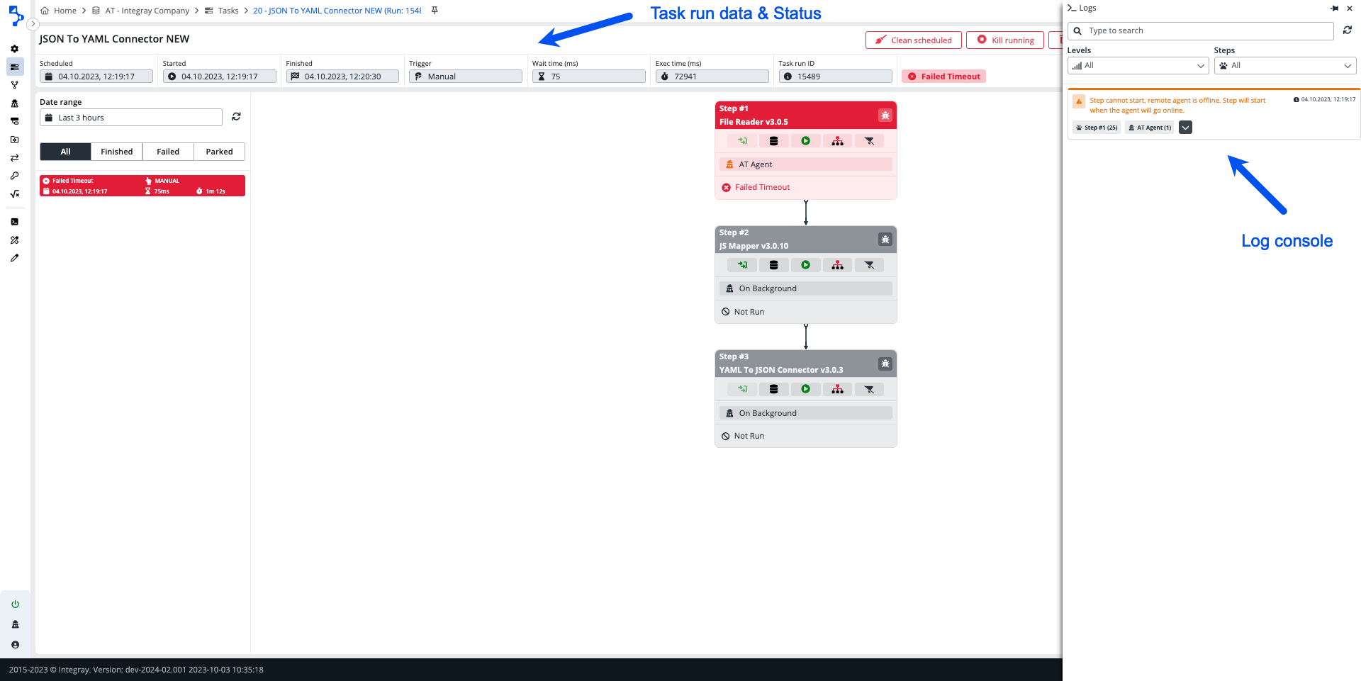ID Status description ID Status description 0 Unknown 301 Failed agent killed 1 Scheduled 302 Failed timeout 100 In progress 303 Failed cancelled by user 101 Waiting for agent 304 Failed run time 200 Finished success 305 Failed agent 201 Finished no data 306 Failed output 202 Finished with errors 307 Failed input 203 Nothing to process 999 Parked 300 Failed connector Generally, statuses 1xx - represent "in progress", 2xx - represent "finished", 3xx - represent "failed".