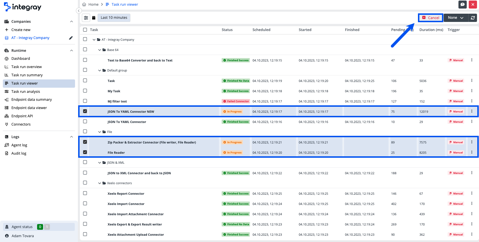 - Cancel - action to cancel the selected task run. Displayed for in progress task runs only (status ID 1xx).