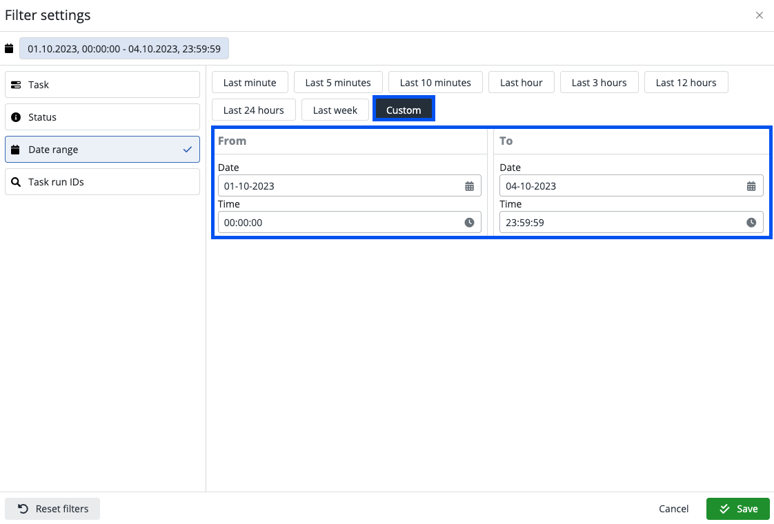 Last minute,Last 5 minutes,Last 10 minutes,Last hour,Last 3 hours,Last 12 hours,Last 24 hours,Last week. Additionally, a custom date range can be set - From:Date&Time, To:Date&Time. -