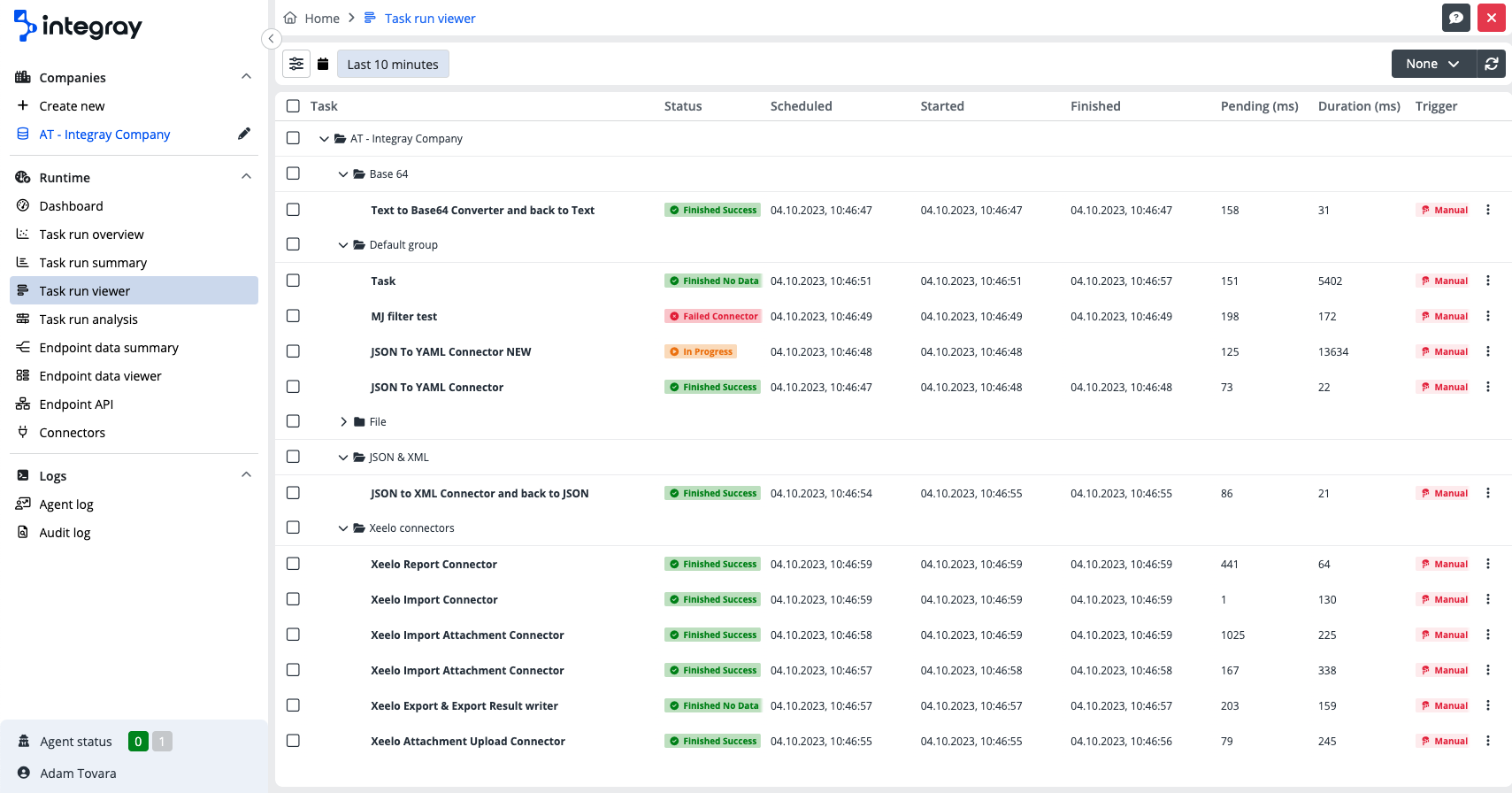 The Task Run viewer can be automatically refreshed at a set frequency of 10 sec, 30 sec, 60 sec, and 5 min. If the frequency is set to None, data refresh must be executed manually.
