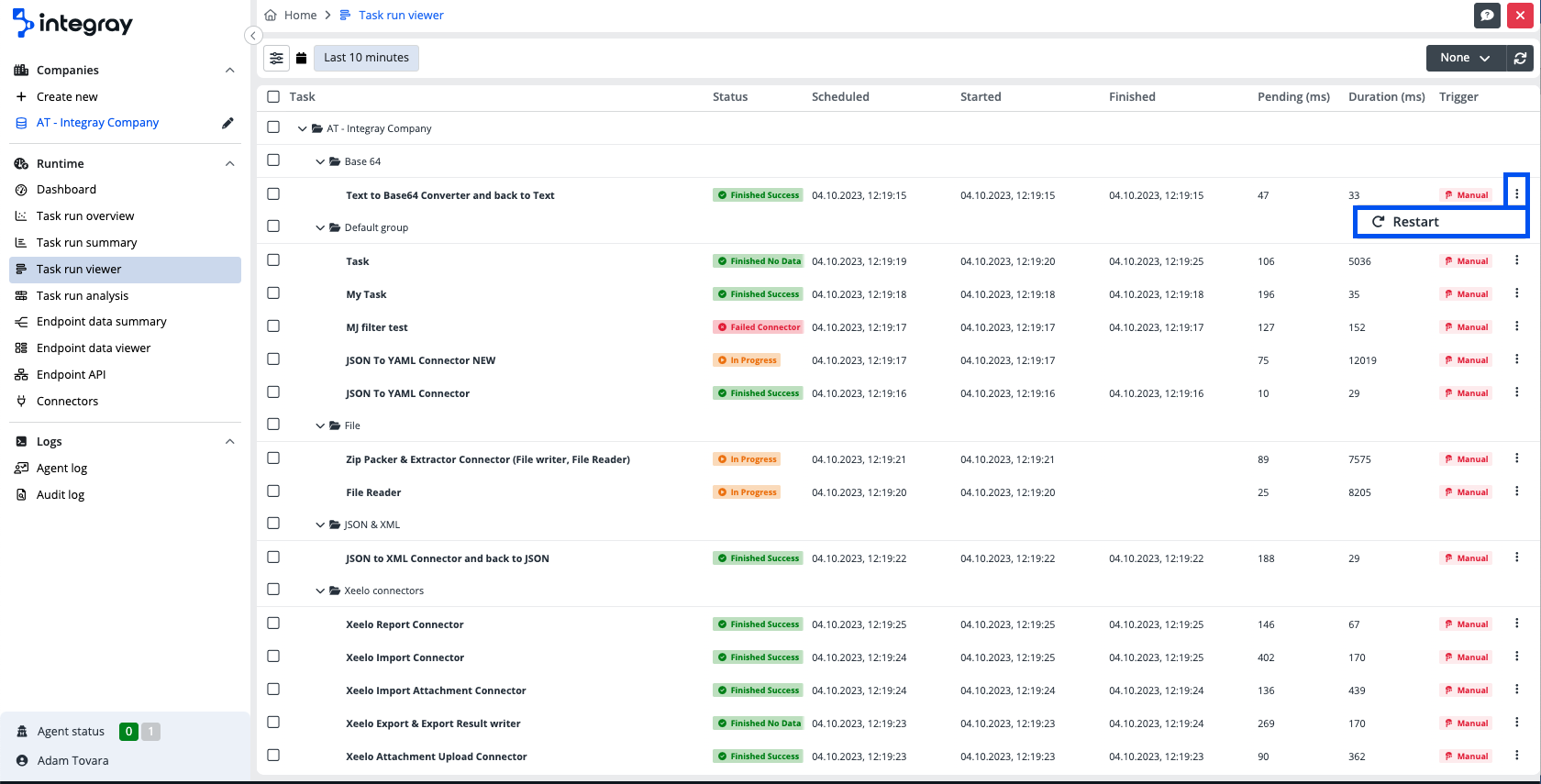 - Restart - action to restart selected task run. Displayed for finished tak runs only (status ID 2xx and 3xx).