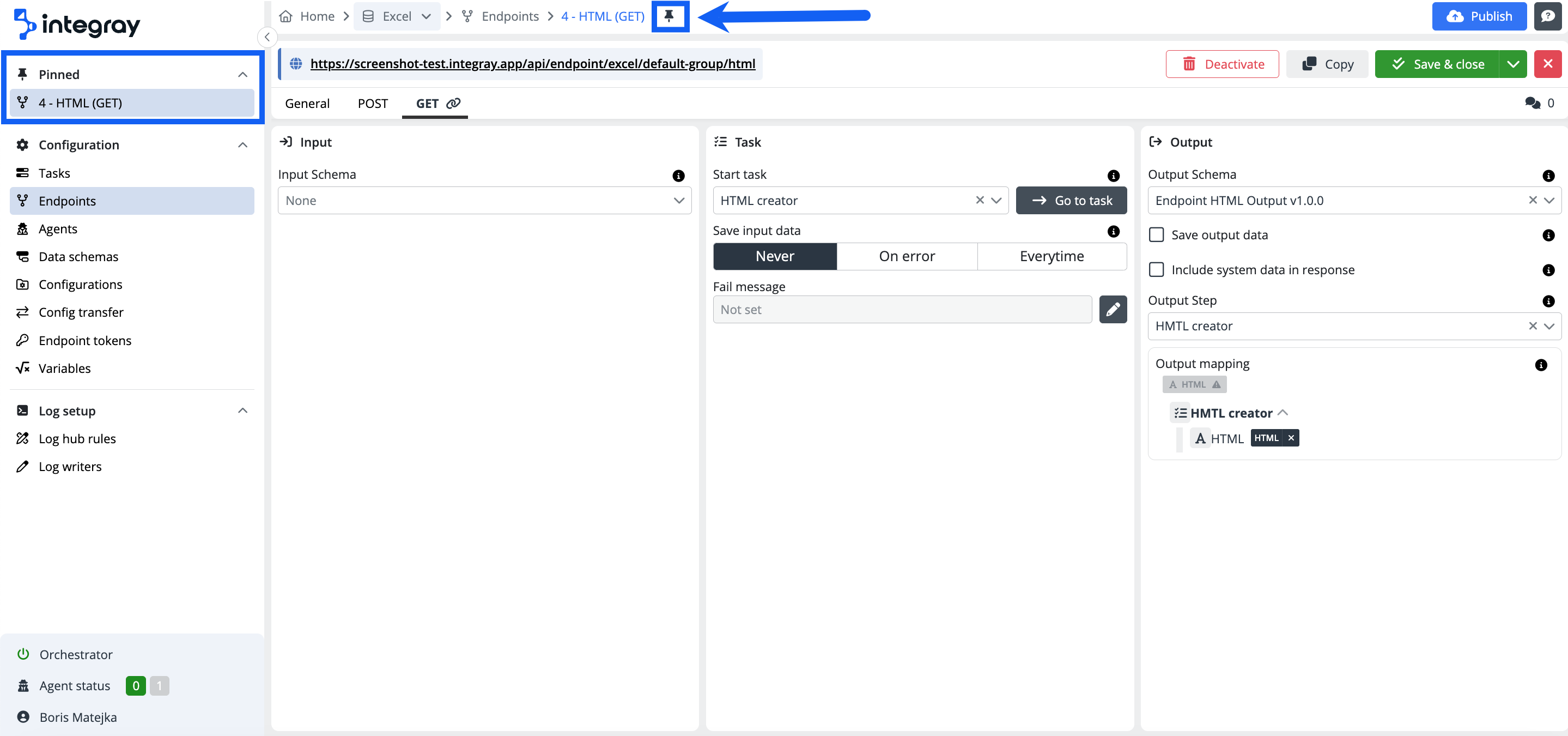 One of the important aspects of effective usage of Integray is a well-organized user interface that minimizes the time spent switching between different sections of the system. The feature that facilitates easier and quicker navigation within the system is Pinning. This functionality has been designed to enhance user productivity and facilitate access to frequently used configurations and information within Integray. Pinning allows you to select commonly used elements and pin them to the left sidebar, where they will remain visible and easily accessible.