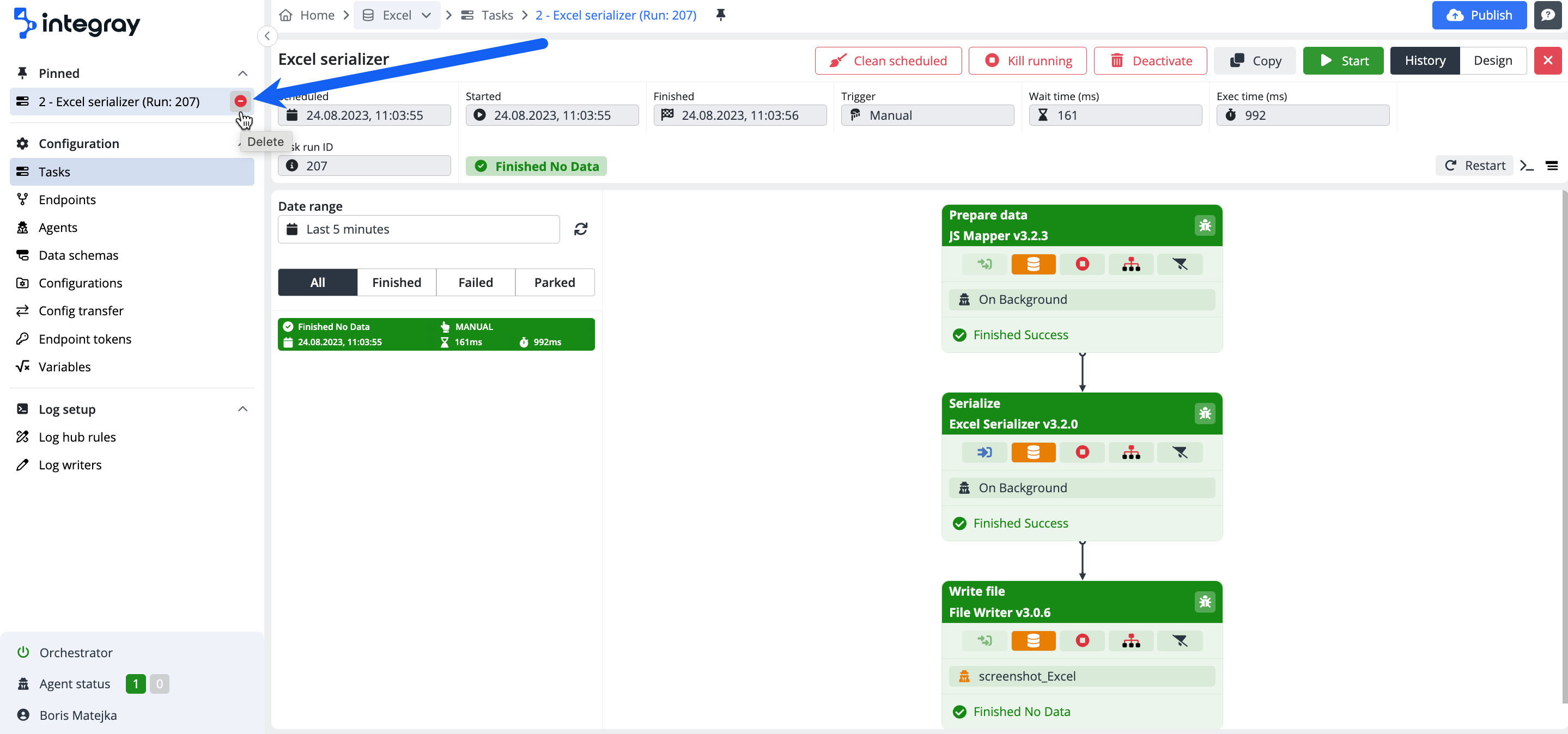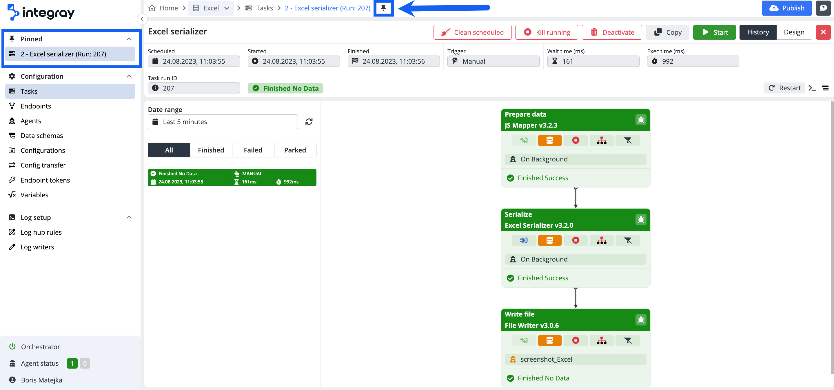 The pin icon has changed (it's all black) and the selected task run will now be added to your pinned items list, located in the sidebar for quick access.