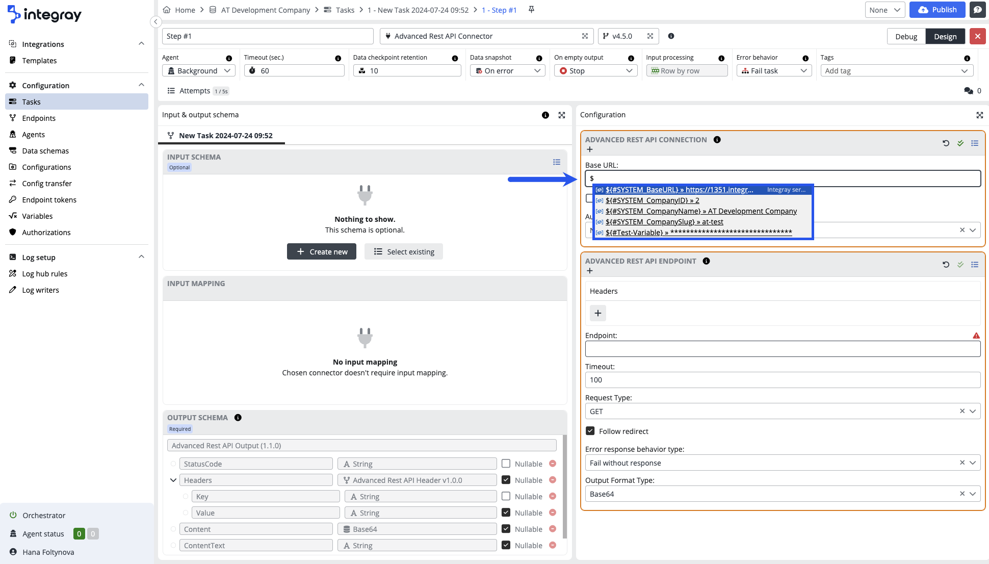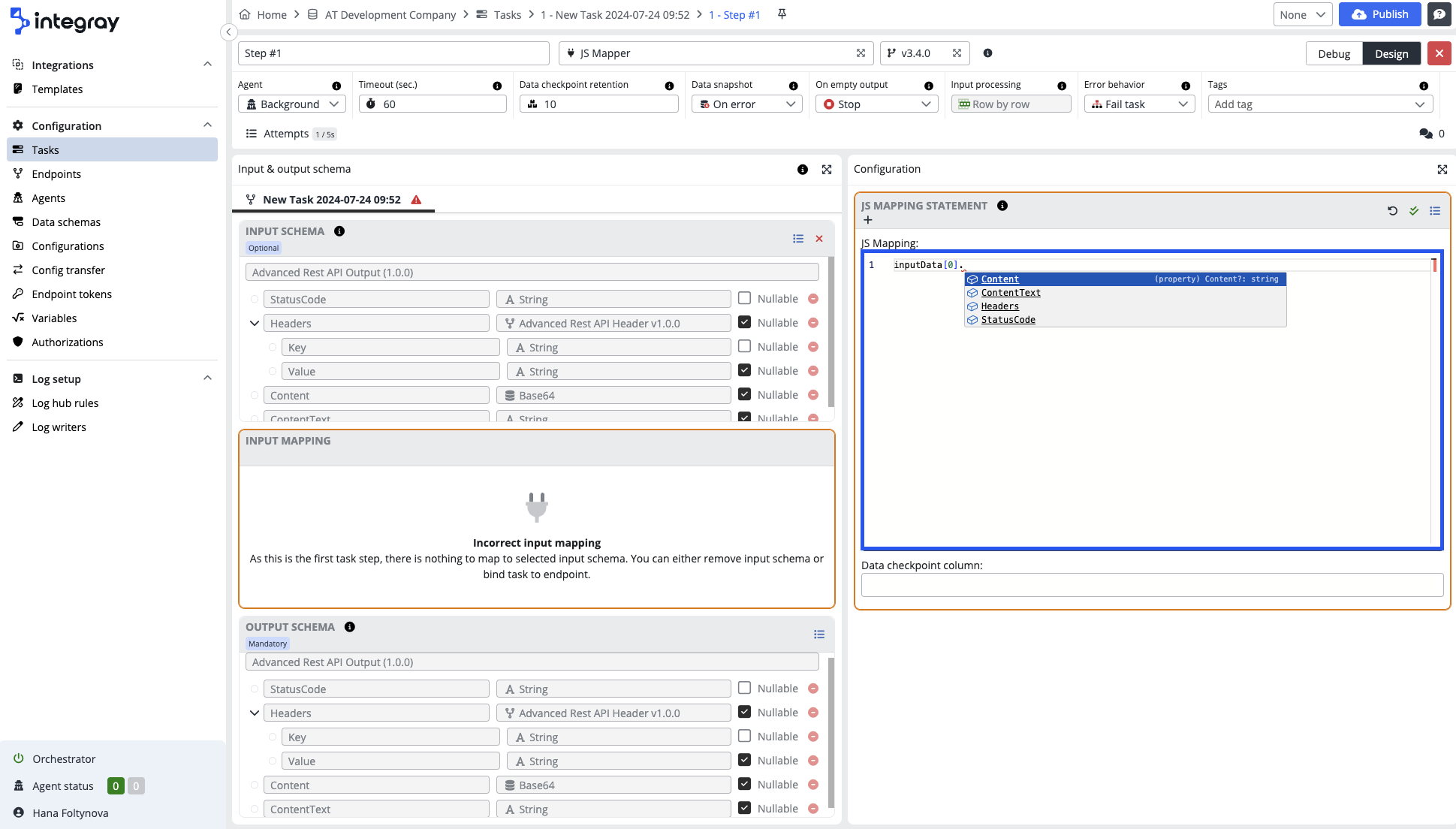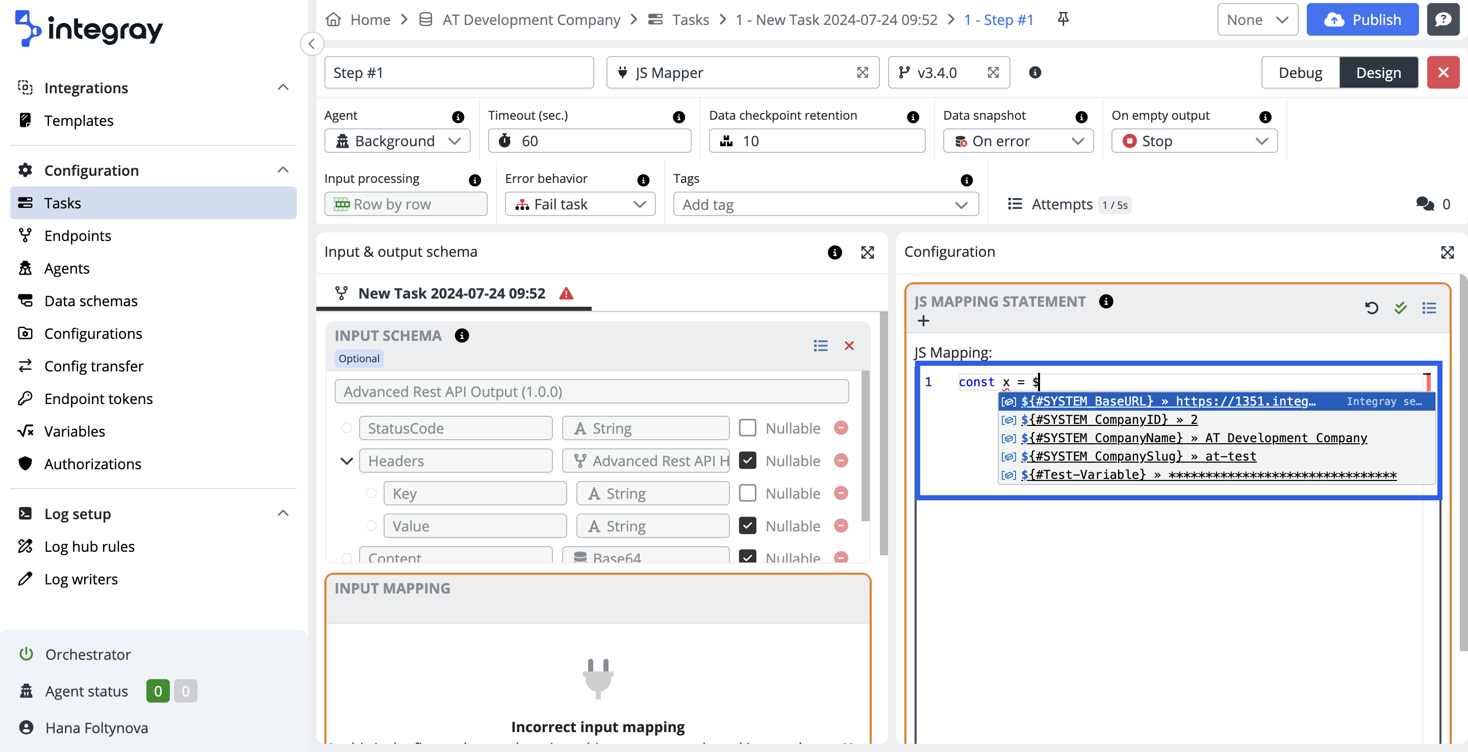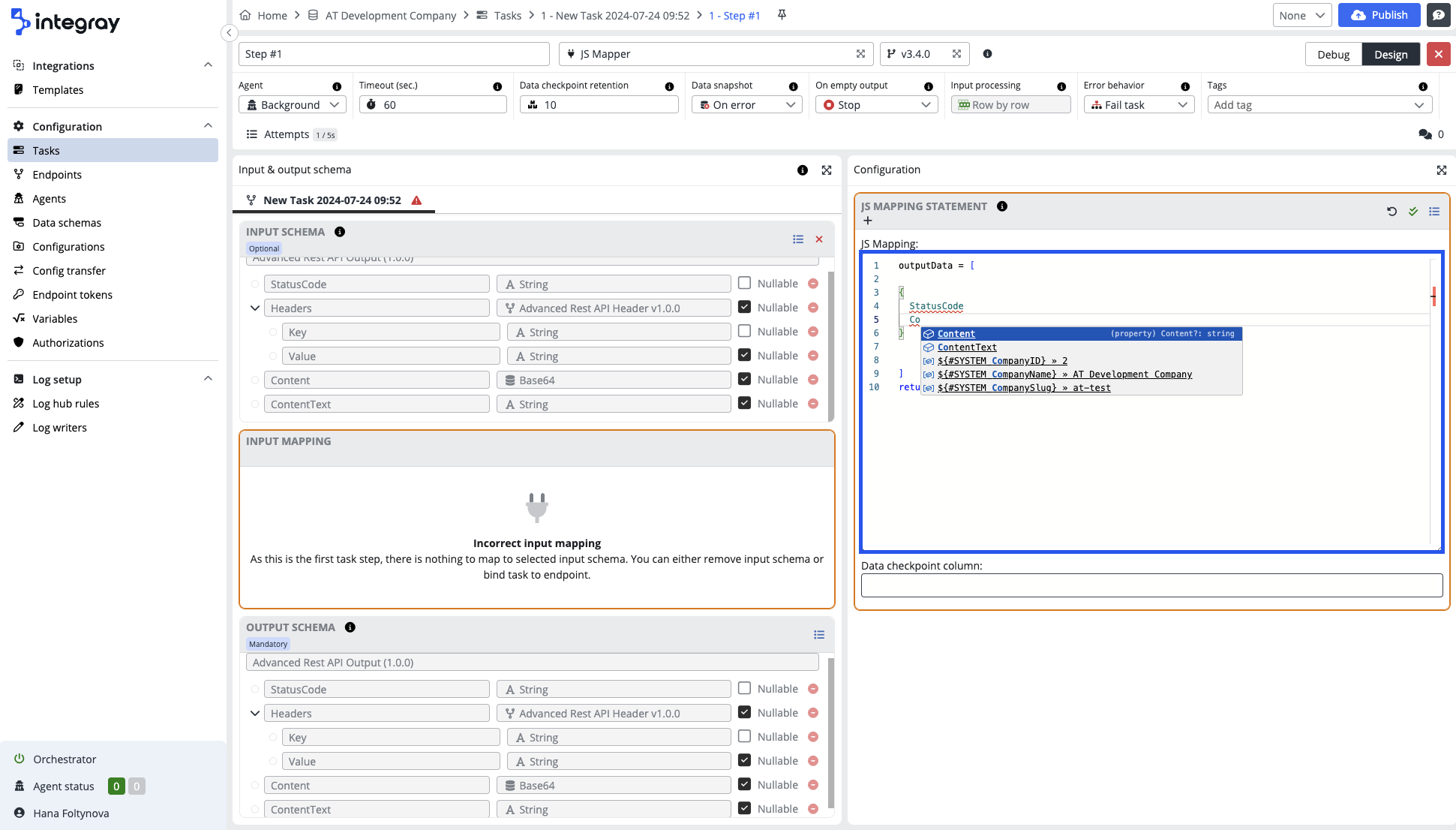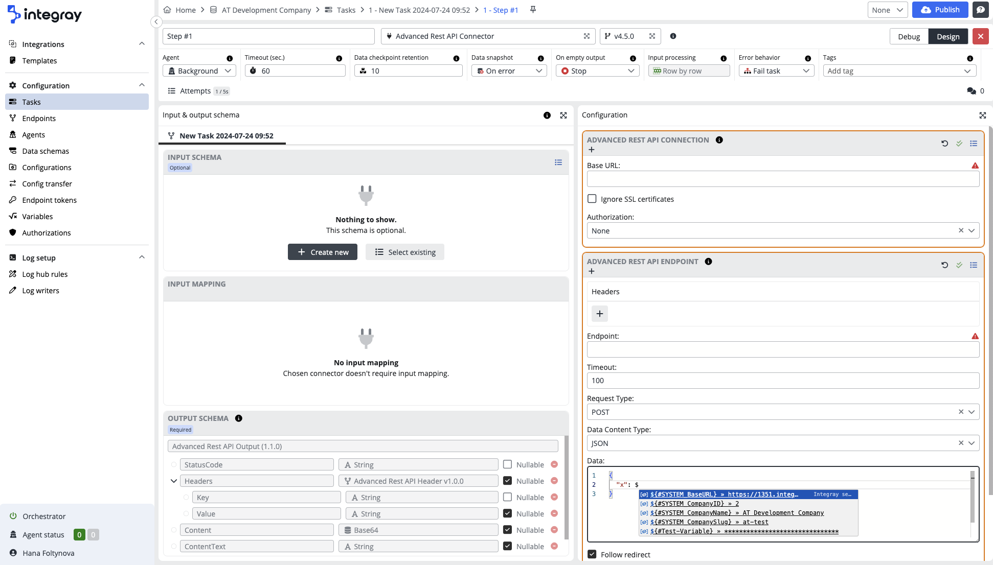 Integray's editor provides support for auto-completion within JSON-based inputs in task step configurations.