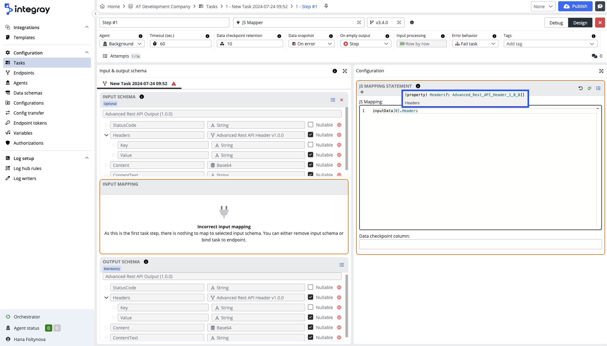 Integray provides comprehensive auto-completion support for JavaScript-based connectors, including JS Mapper and Node.js. This feature enhances the development experience by offering real-time code suggestions and detailed information about input and output data and variables.