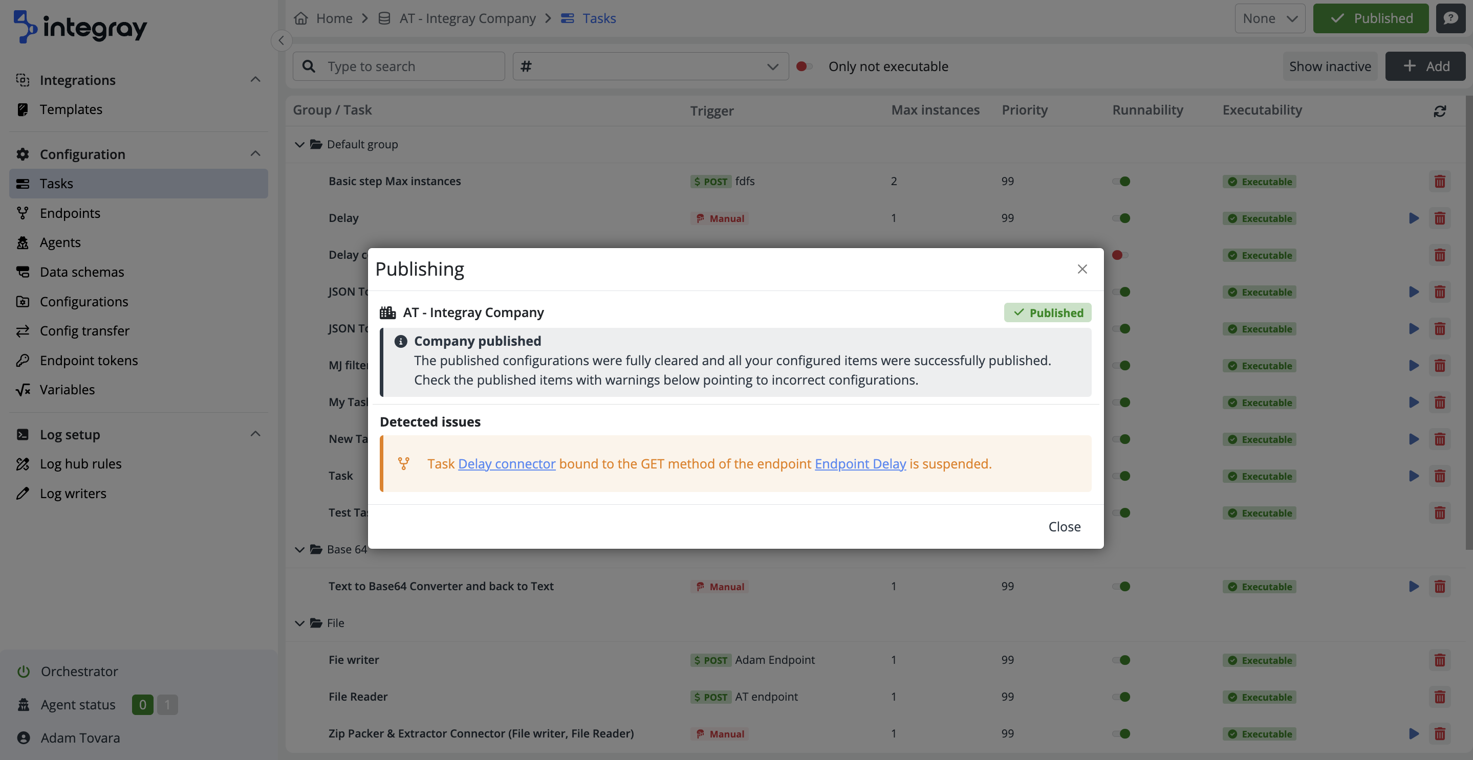 Cache publish updates the entire cache with valid Tasks / Endpoints only. Omitted items are displayed as Error with explanations and links. Special cases are displayed as Warnings (see below). The overall status is always Success, except when nothing can be published. In such a case, the overall status is Error, and the cache is unchanged.