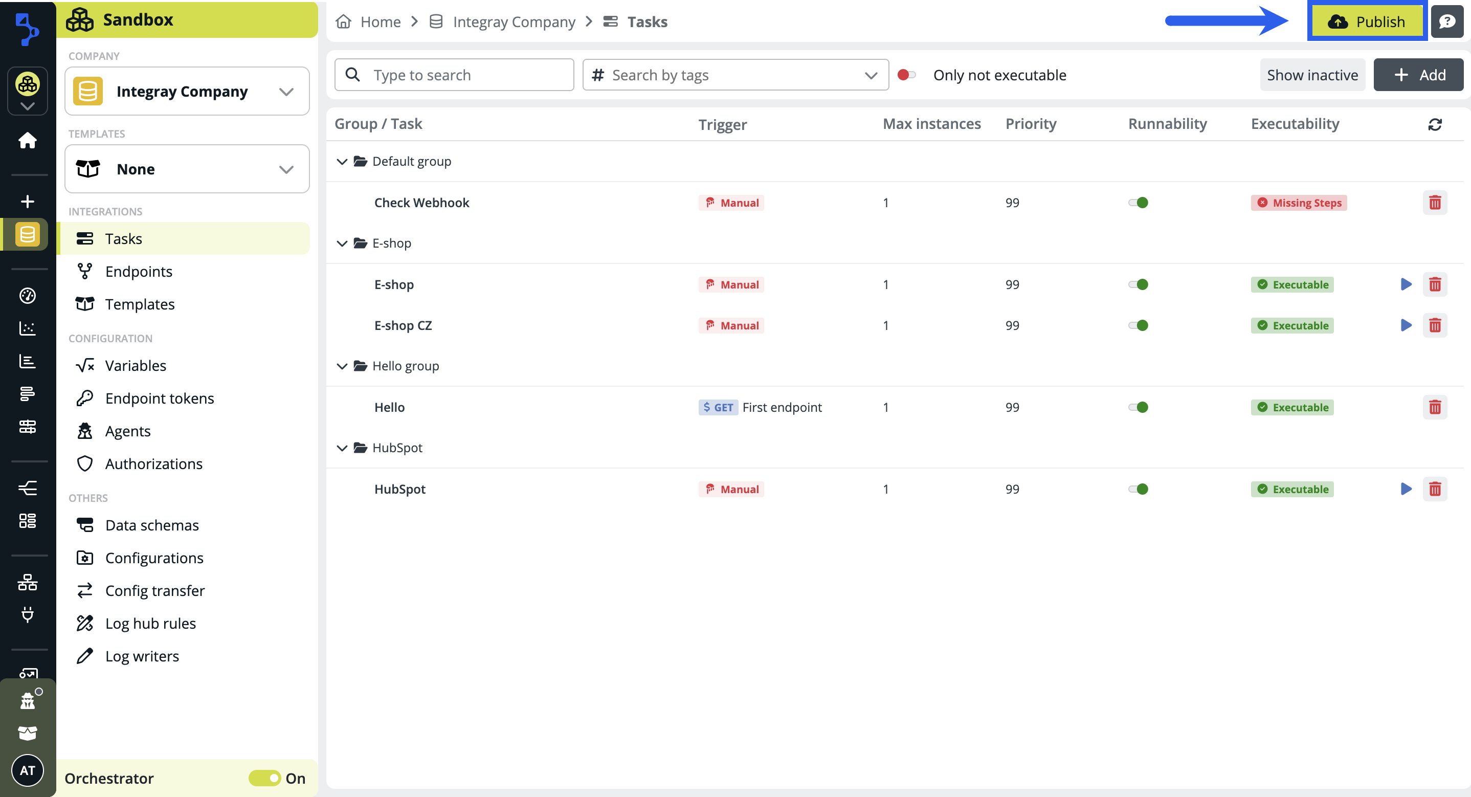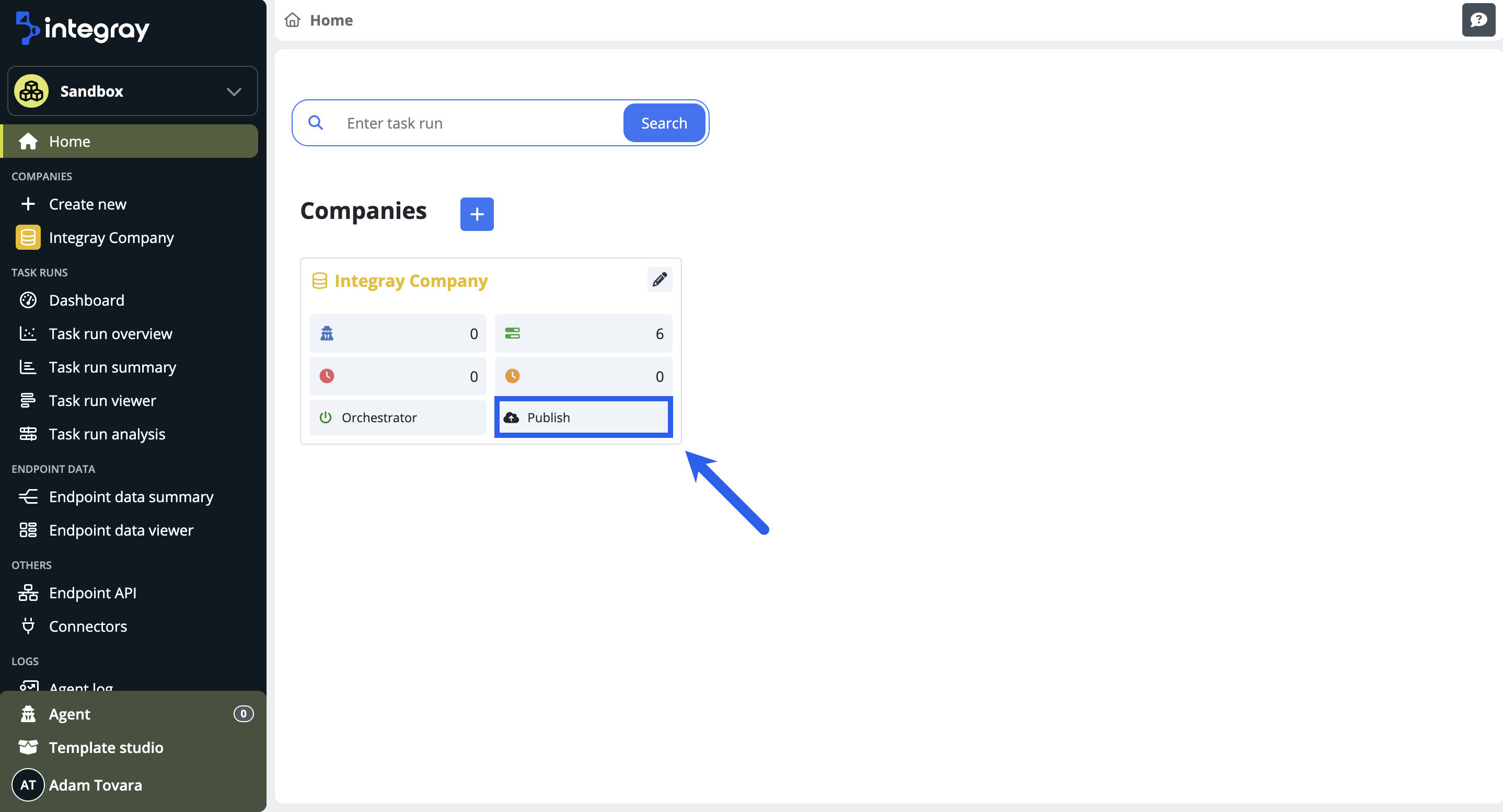 You can also find the Publish button in the top right corner after you open a specific company. The button is consistently displayed across all items in the left side panel, including Tasks, Endpoints, Agents, and more.
