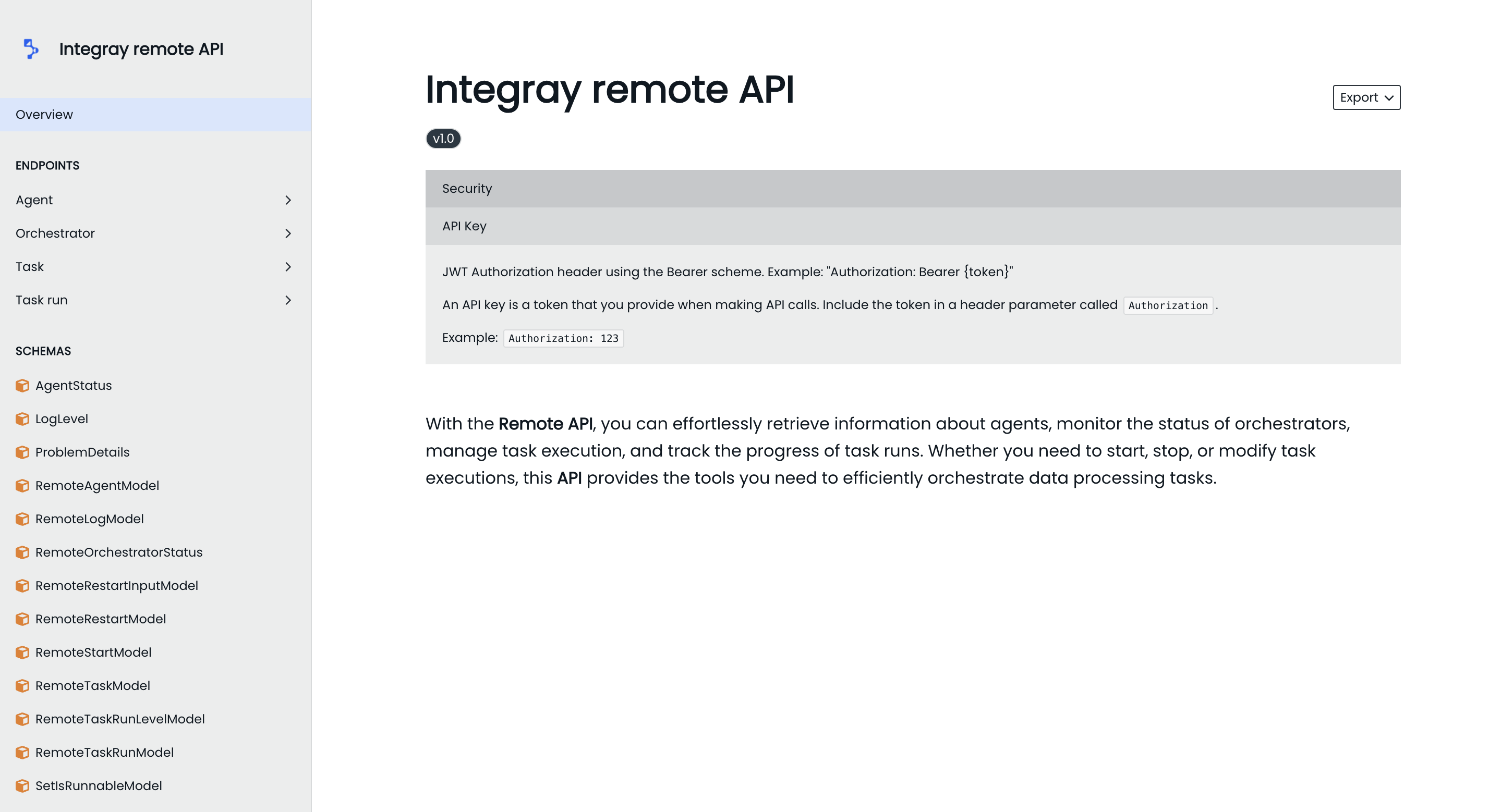 The documentation is divided into two sections. The Endpoints section provides a detailed look at the various API endpoints, illustrating how to perform actions and retrieve data effectively. Following this, the Schemas section delves into the data structures that define and govern the exchange of information between your applications and the Remote API.