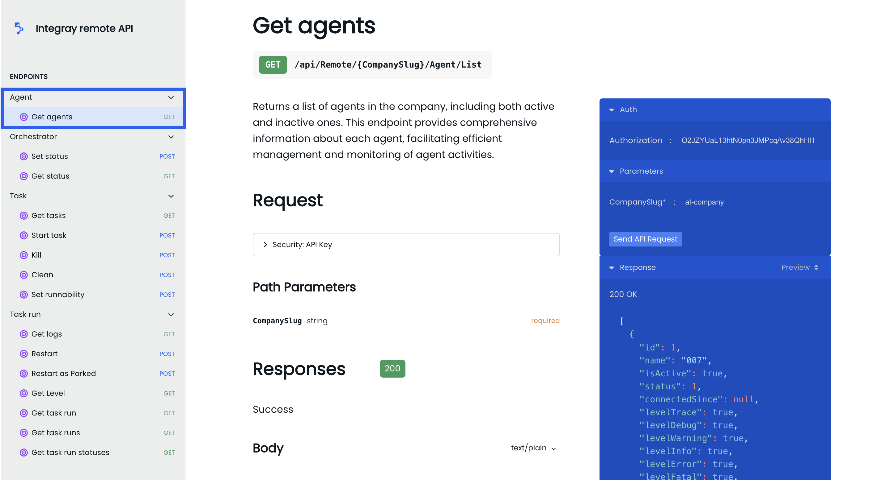Get agents: This endpoint returns a list of the company's agents, including both active and inactive ones. It provides comprehensive information about each agent, facilitating efficient management and monitoring of agent activities.