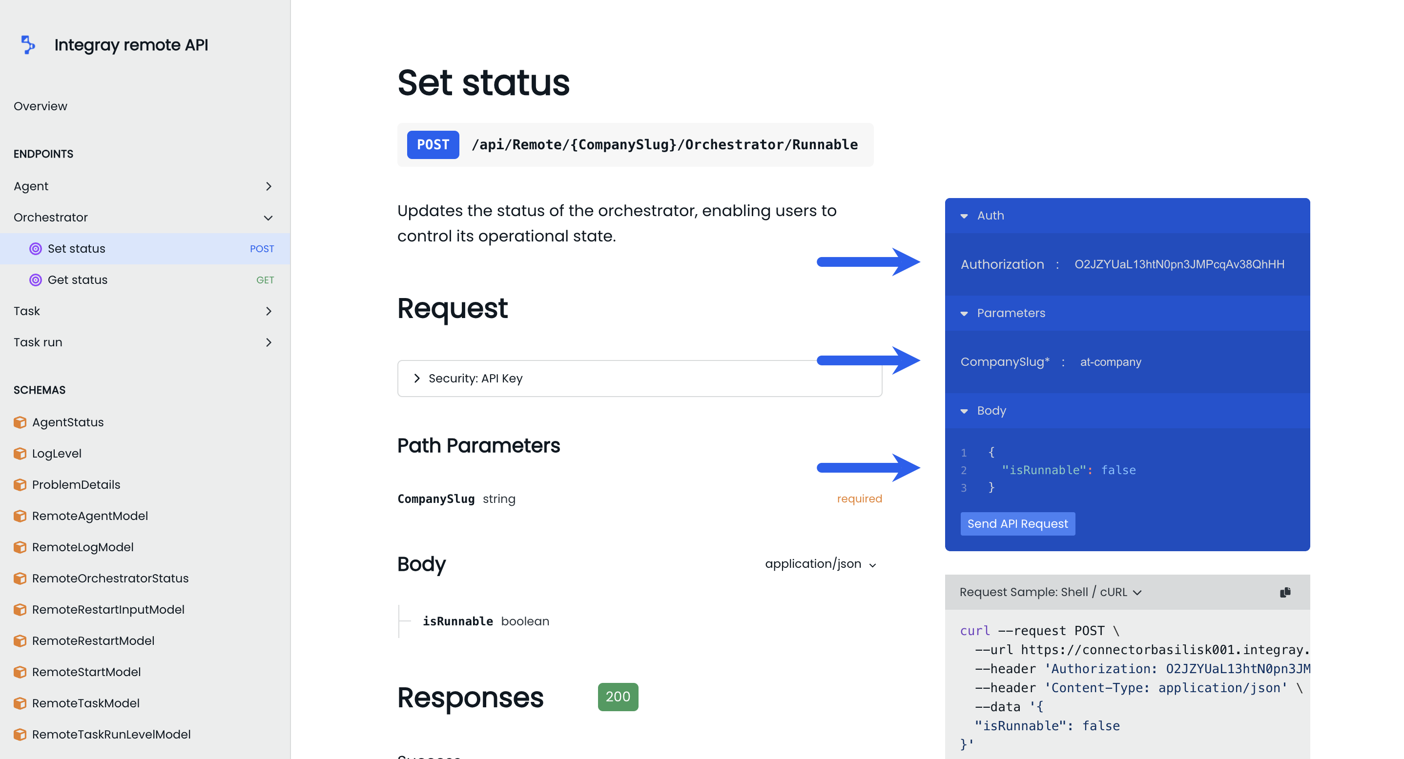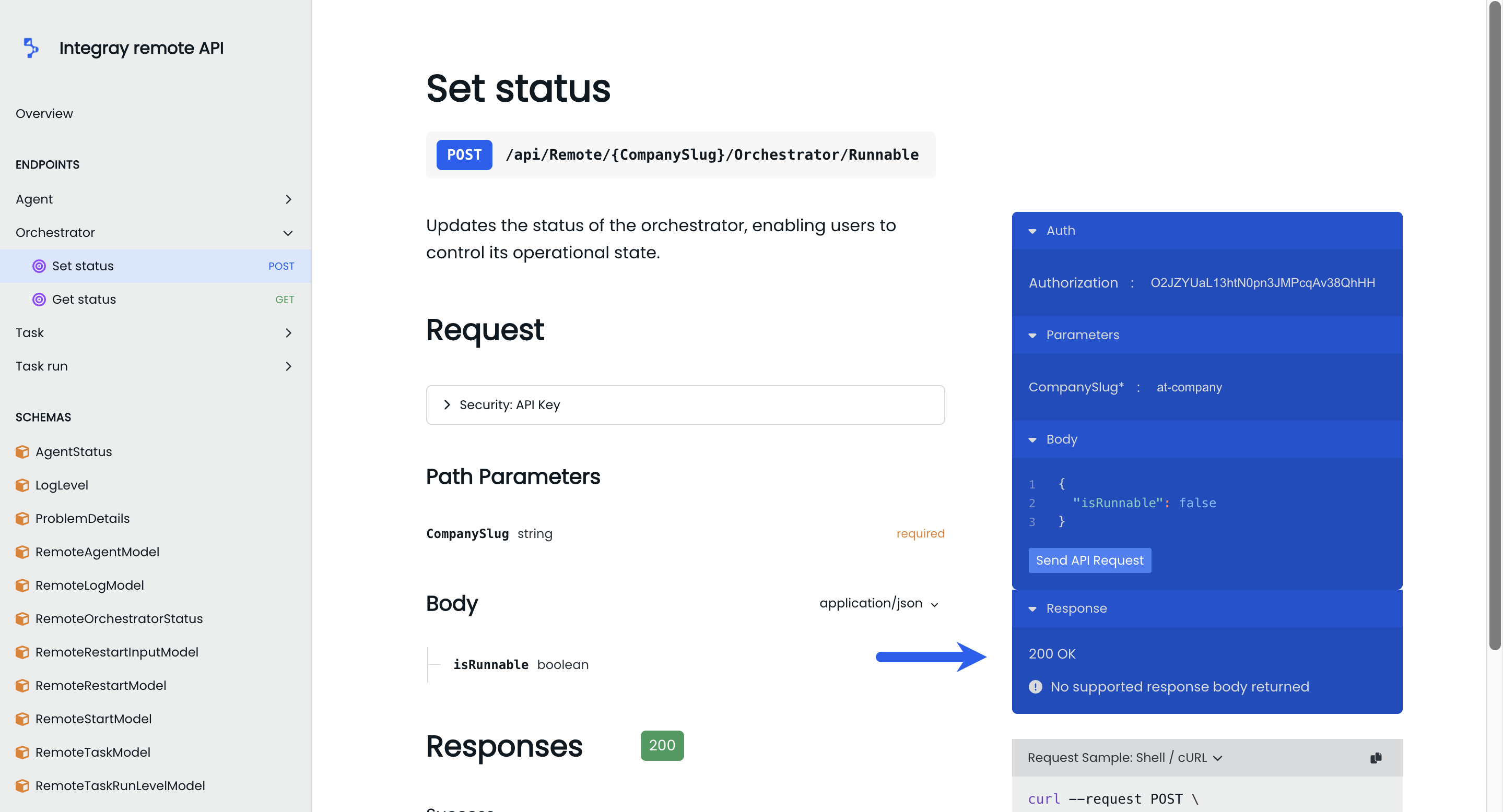 To modify the orchestrator's state, use the Set status endpoint within the same Orchestrator category. You need to provide the CompanySlug and Authorization token and also specify the desired state by setting the isRunnable attribute in the request body to either true (to activate) or false (to deactivate). The request can be executed by clicking the Send API Request button.