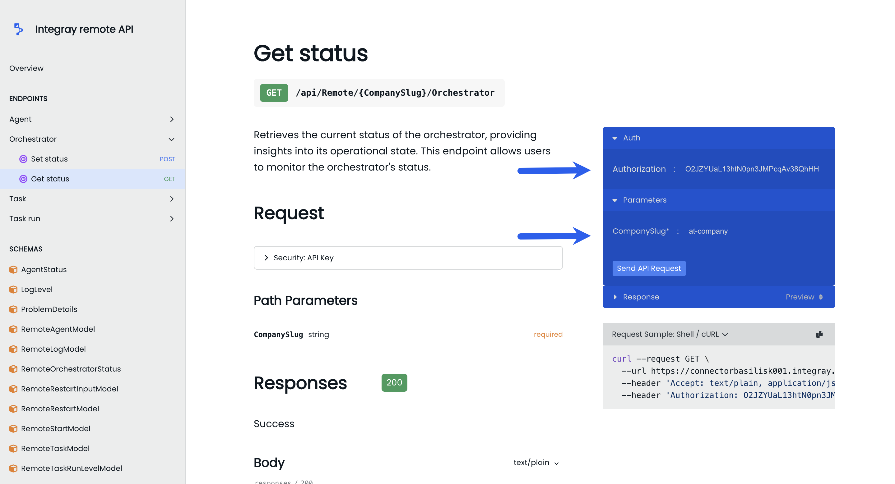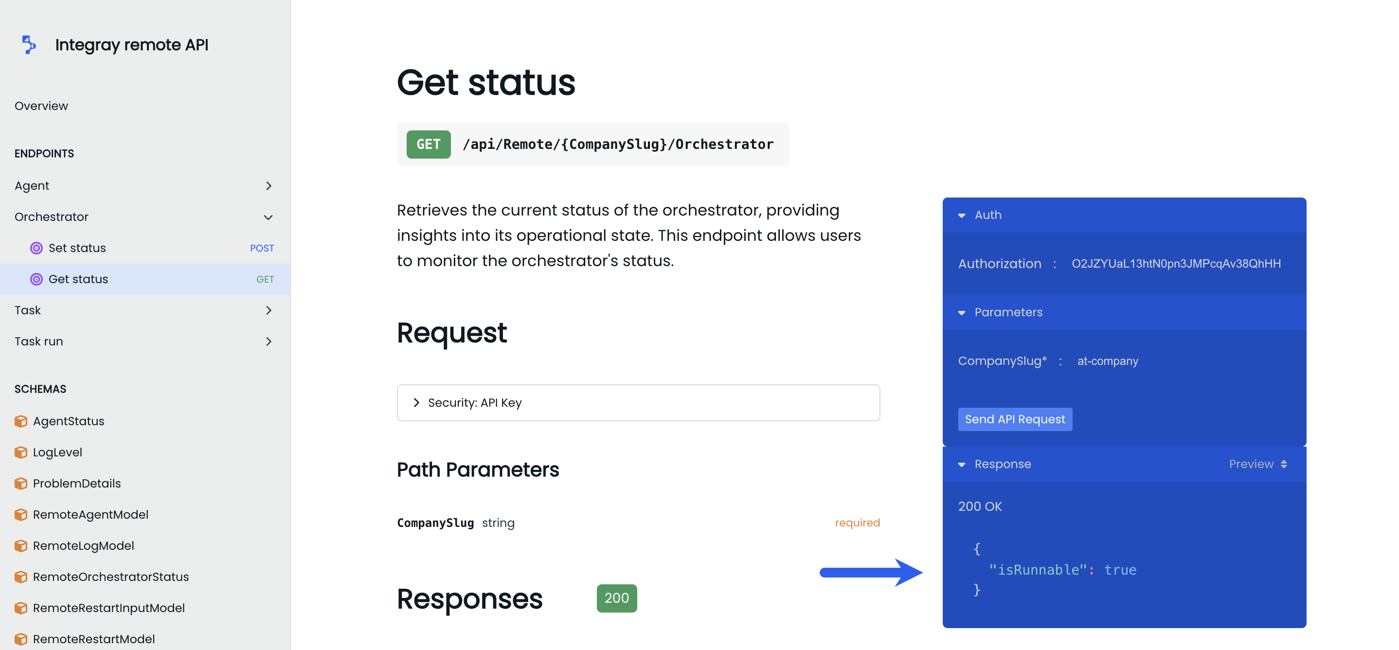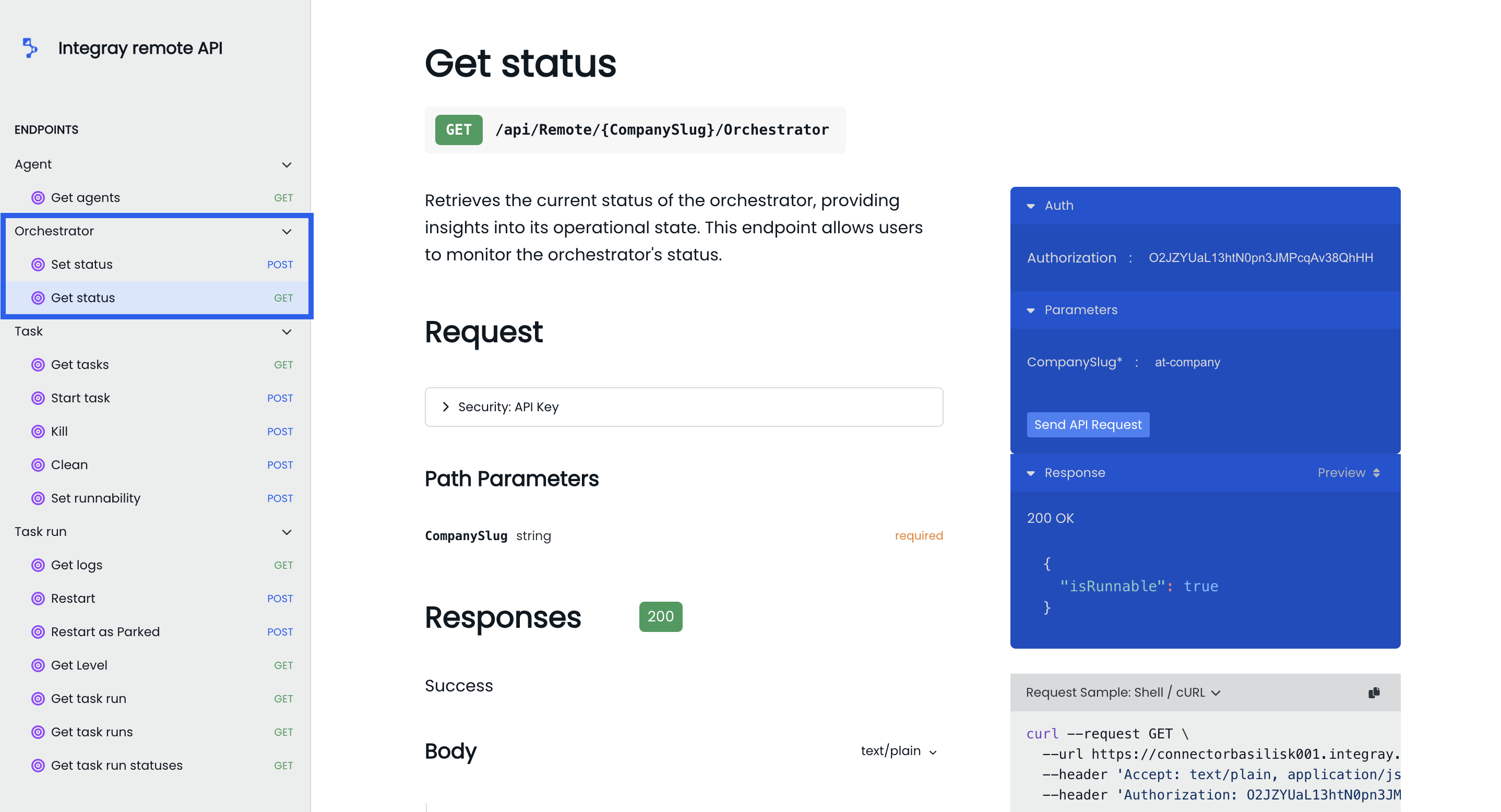 To view the current status of an orchestrator, navigate to the GET status endpoint under the Orchestrator category. You must input the required parameter CompanySlug to specify which company's orchestrator you are querying and include the Authorization token for authentication. The request can be sent by clicking the Send API Request button.