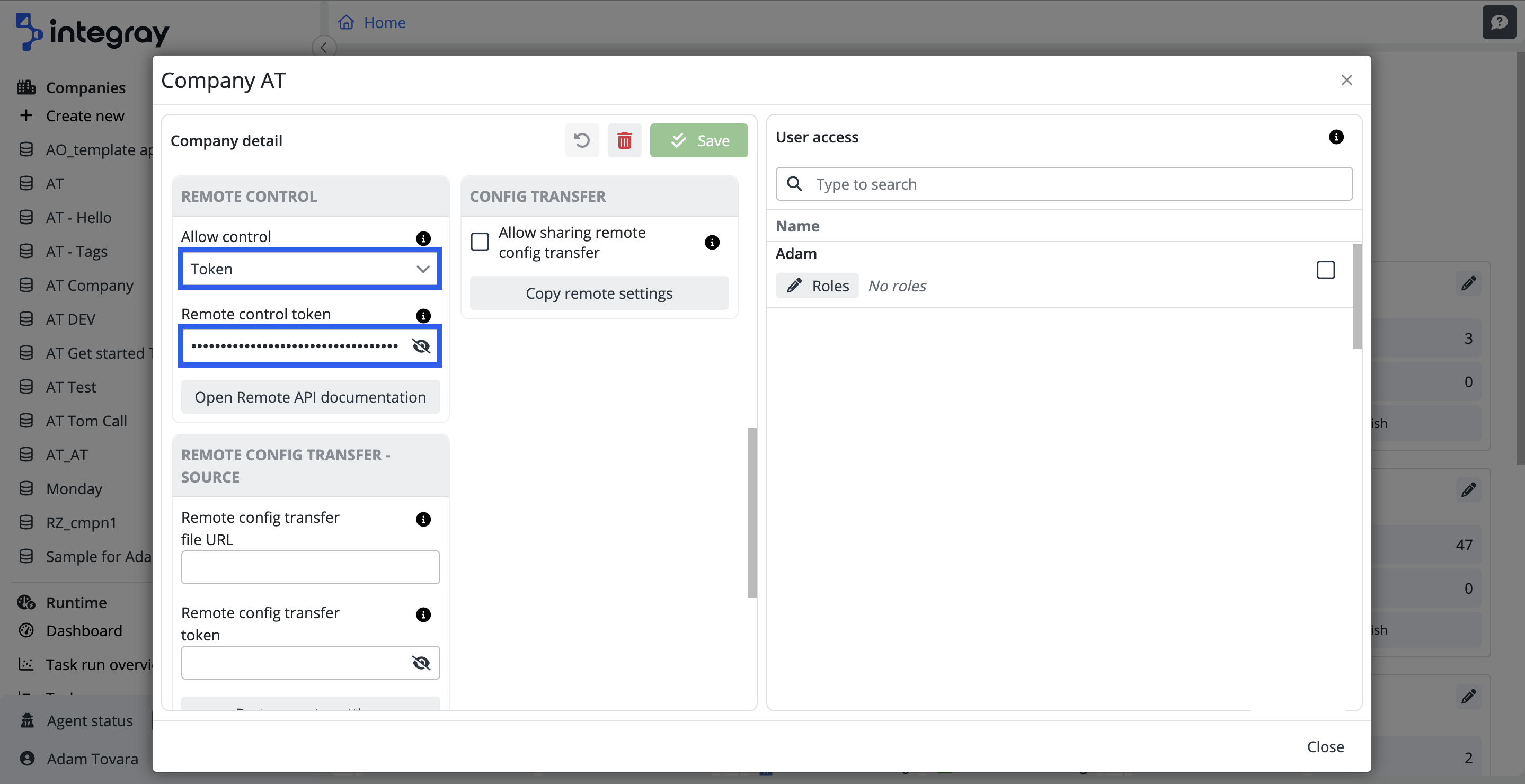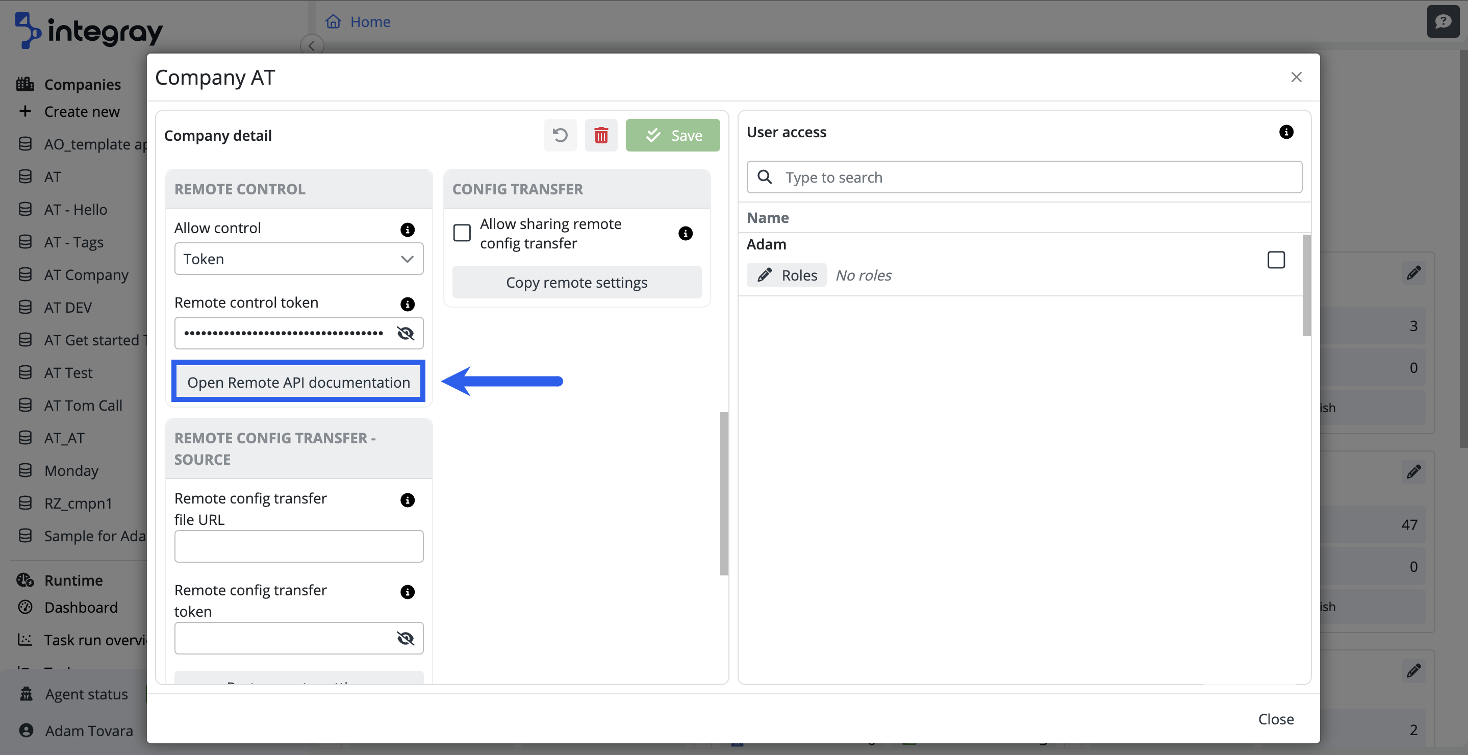 To access the Remote API documentation, navigate to the Home page of the Integray platform. Locate your company and click the pencil icon next to the company name to open the Company Details. In the Remote Control section, click the Open Remote API documentation button.