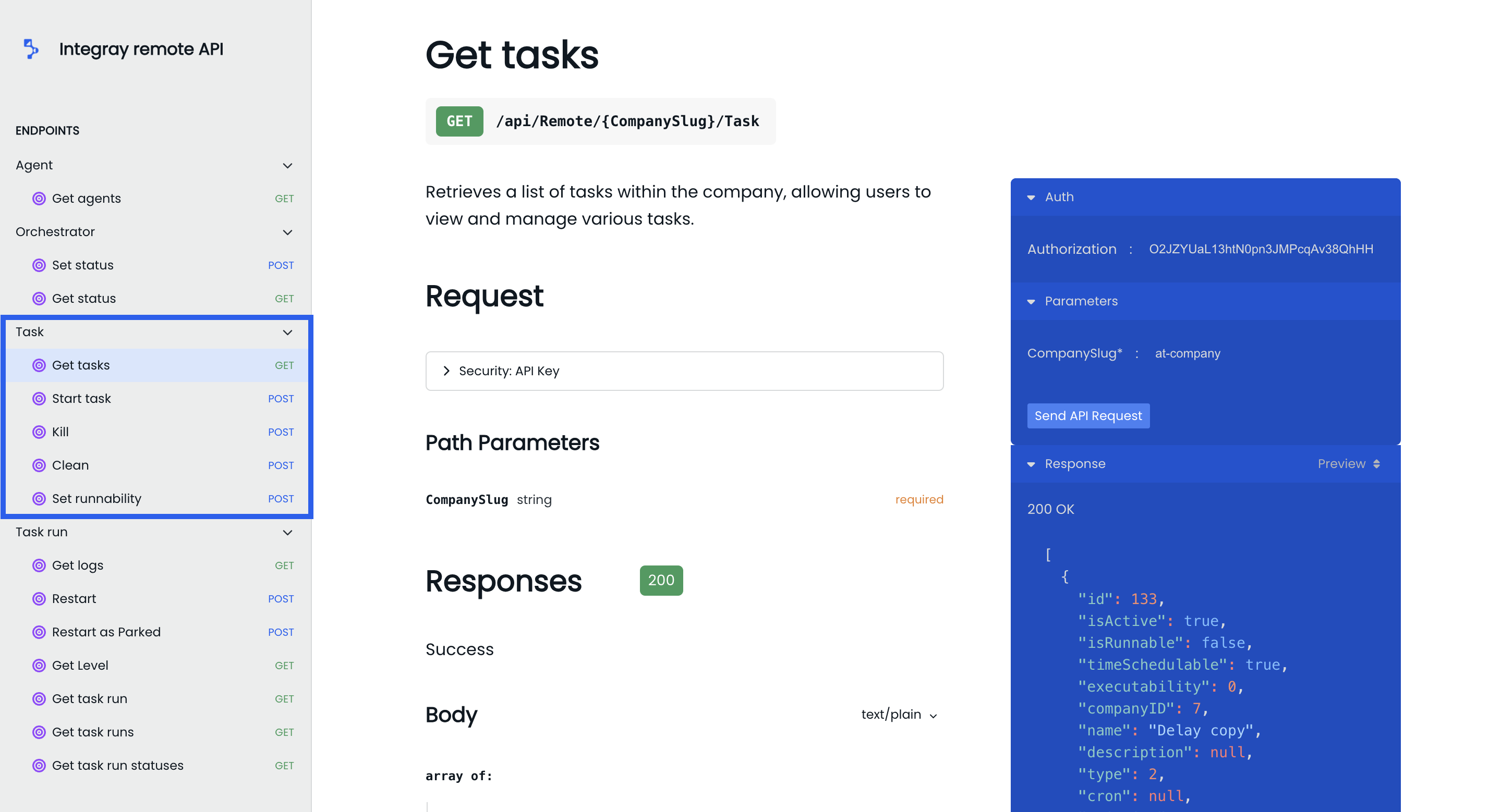 Get tasks: This endpoint retrieves a list of tasks within the company, allowing you to view and manage various tasks.