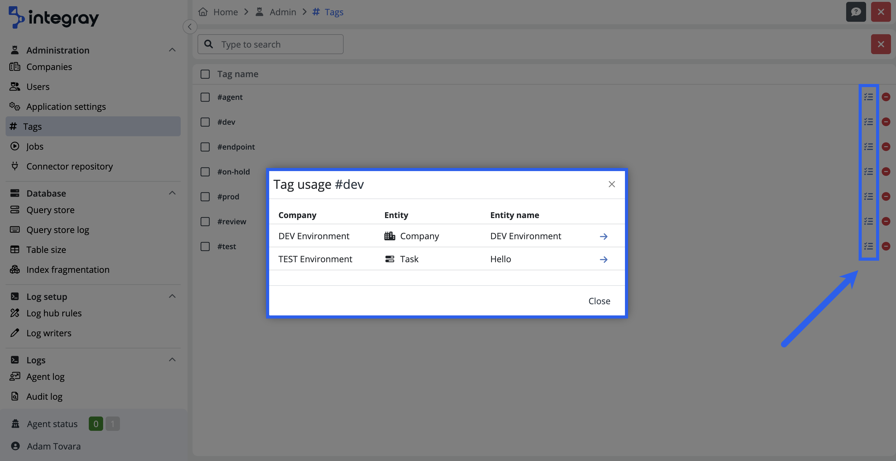 The ability to see where individual tags are assigned provides administrators with a comprehensive overview of tag usage across the entire instance. This functionality is accessible through a blue button located at the end of each tag's row in the list. Clicking on this button opens a modal window titled Tag Usage. In this window, a list shows all the places where the specific tag is assigned. It includes detailed information about the company and entity where the tag is used. Additionally, each item in the list contains a direct link, enabling users to navigate directly to the entity.