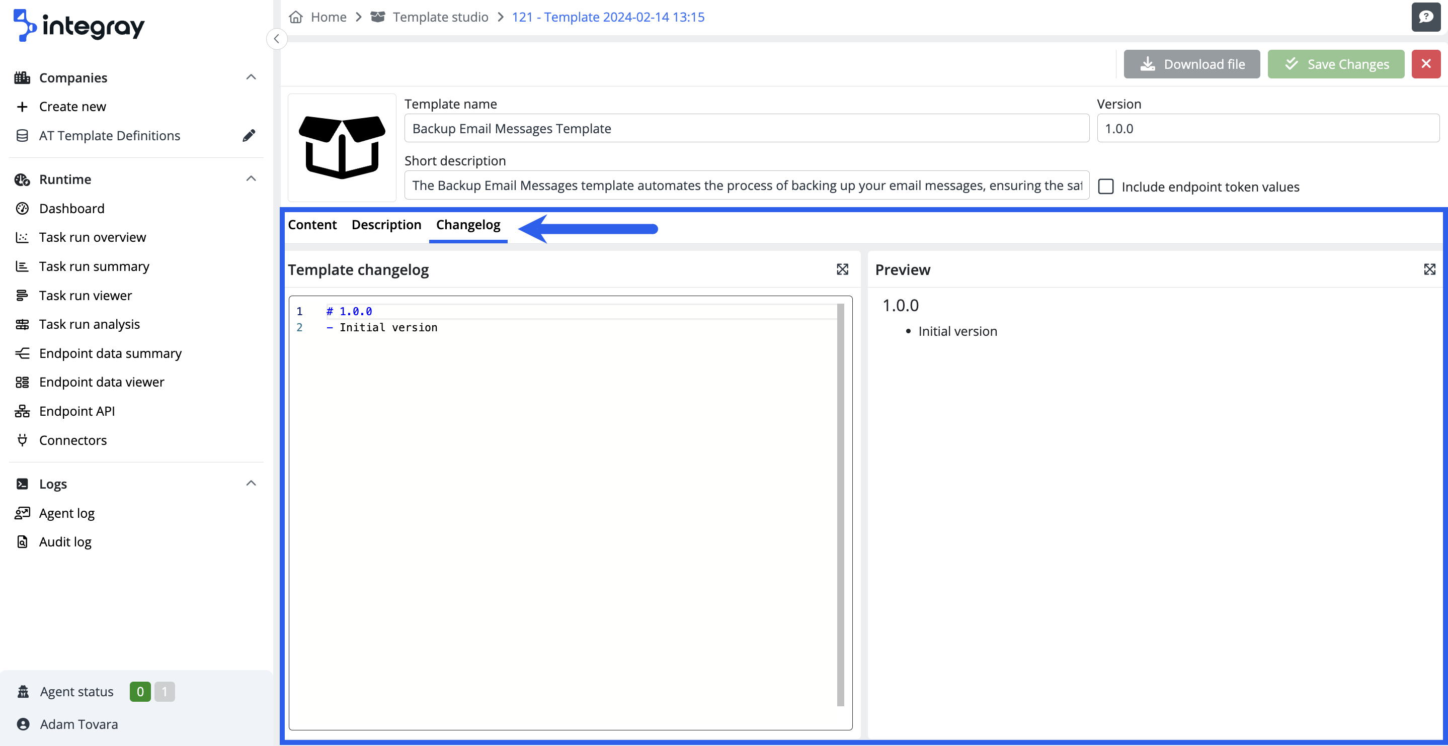 A change log, also known as a record of changes, is a section complementing the overall description of a template. Here, you can record the template's significant modifications, updates, and fixes. This tool is essential for both users who define the template and those who apply it. In this editor as well, Markdown formatting is utilized for writing in the left part, and on the right part, you'll see a preview of how the text will appear to users applying the template.