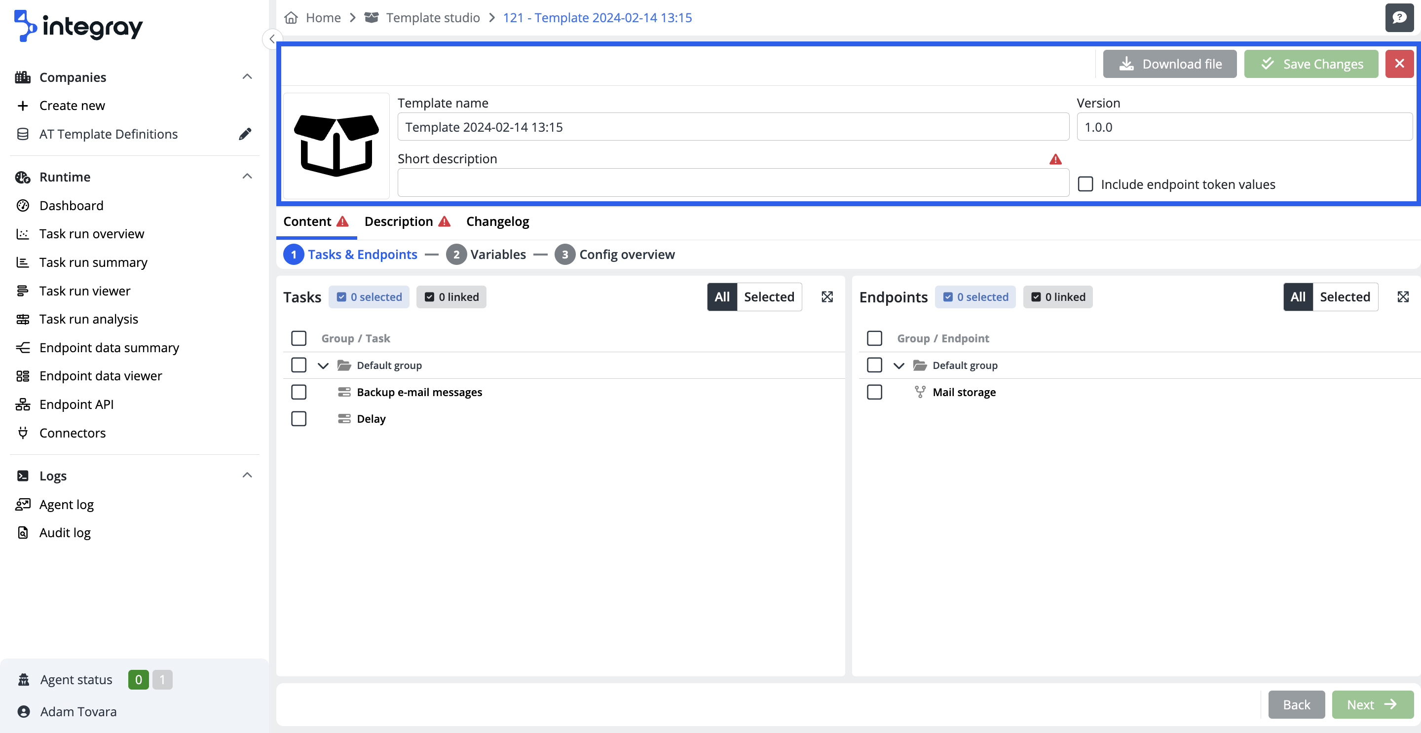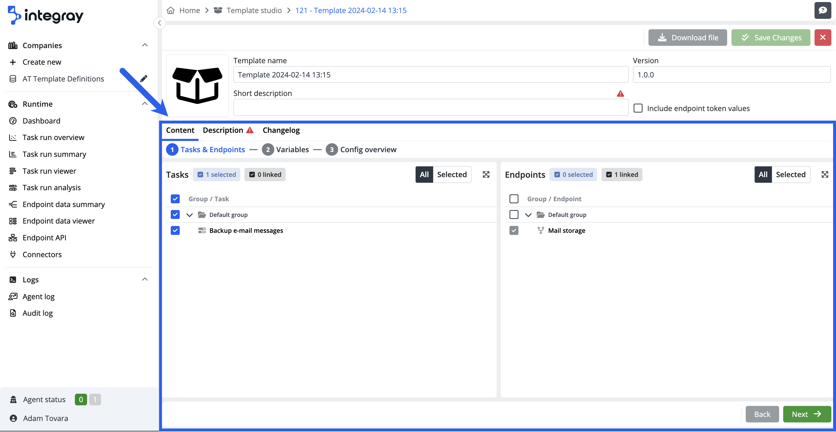 The Template Content Editor is organized into three tabs: the Task & Endpoints, Variables and Config overview. On the first tab you will find two main sections: Tasks and Endpoints. In the Tasks section, select the task you wish to create a template for. If the selected task is bound with an endpoint, that endpoint will automatically be selected to the right in the Endpoints section by the system. Similarly, suppose you start by selecting an endpoint in the Endpoints section that is bound to a specific task. In that case, the related task will be automatically selected in the Tasks section. This reciprocal selection mechanism ensures a seamless integration between tasks and endpoints within your template creation process.