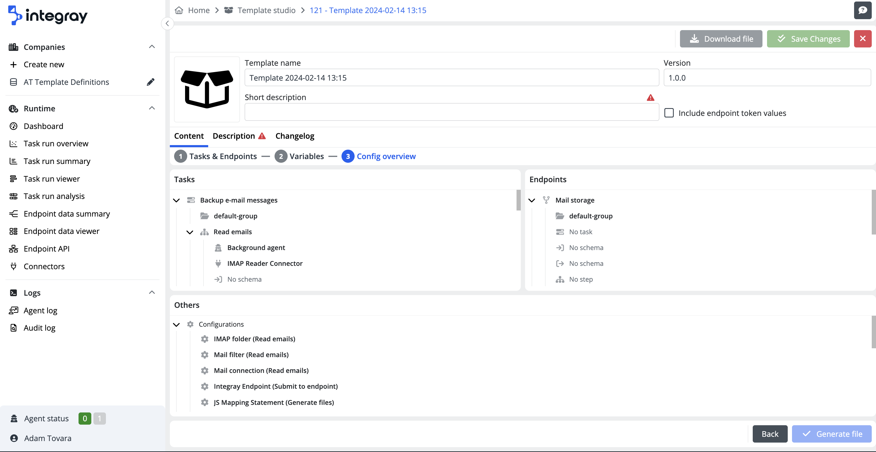After filling in all required details and customizing the template as per your preferences, click the Generate file button in the Config overview tab of the Content editor to start generating your template. A toast notification, "File successfully generated," will appear to confirm the file's generation. After generating the file, the system will enable the Download file button in the Template header menu, which lets you download the template as a JSON file. The system will name the file after the template. Once downloaded, you can share your template with other users.
