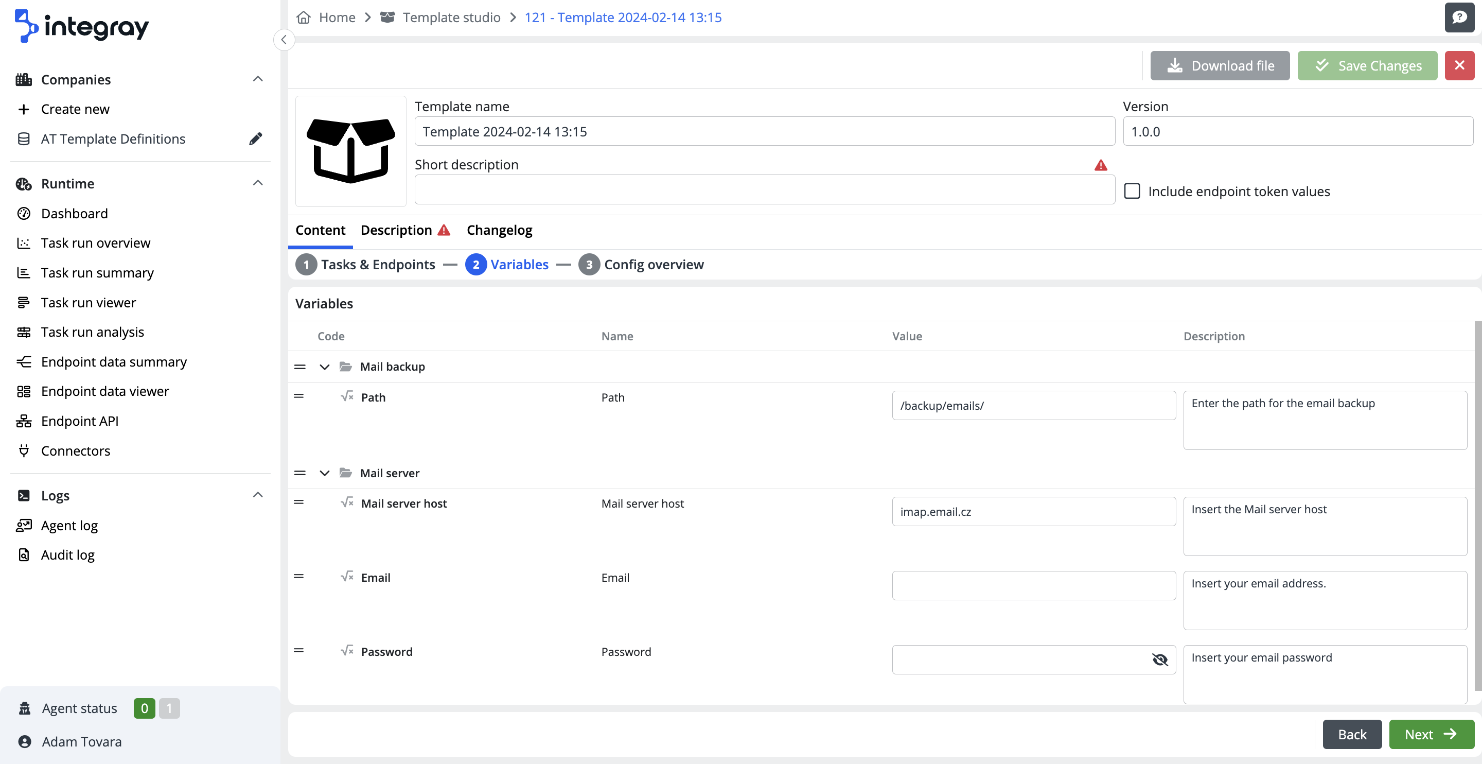 Once you've selected the necessary Tasks and Endpoints, use the Next button in the bottom right corner to move to the Variables tab to the next phase of defining your template, which focuses on Variables. If your integration includes Variables, their list will be displayed here. This list provides details such as the variable's Code, Name, Value, and Description. These details can either be retained in their initially loaded state or modified to suit the specific requirements of your template creation. When applying the template you've created, users will be prompted to fill in, adjust, or maintain the values in these variables according to their specific needs.