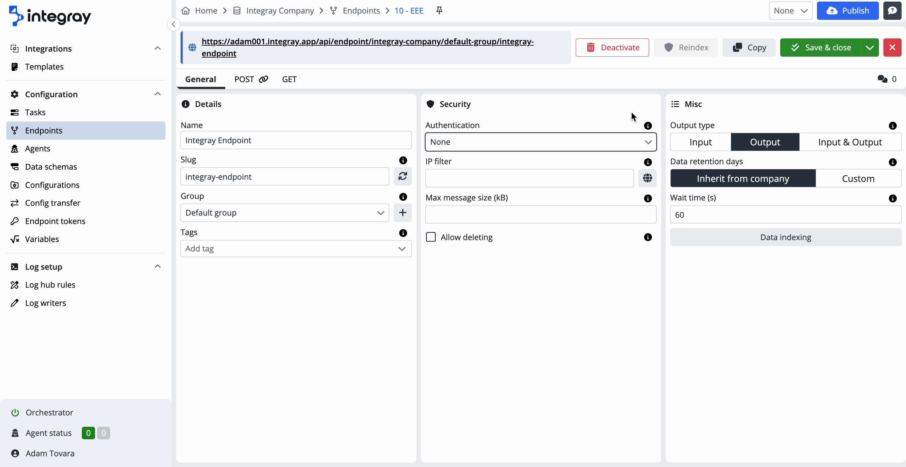 Now, selecting the Internal authentication type automatically applies Integray's primary token protection to the endpoint. Although the Token tab will not be visible to you, the endpoint remains fully secured and accessible only through Integray's service.