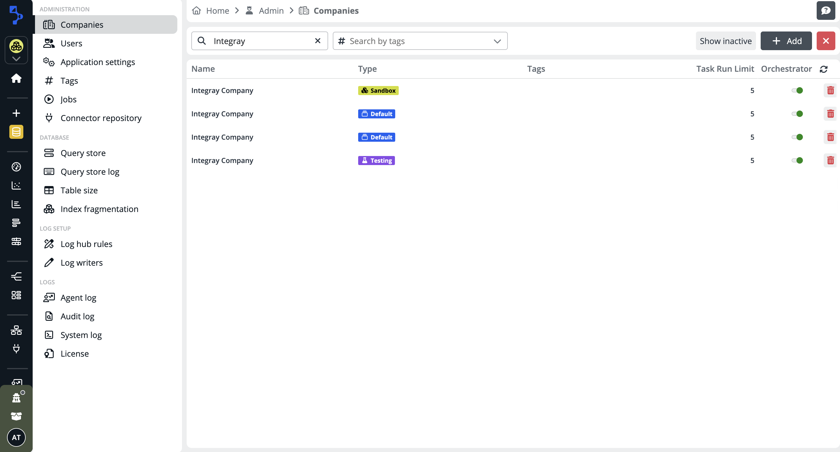 • Company type selector (Sandbox, Testing, Production, Default), automatically updates the company list.